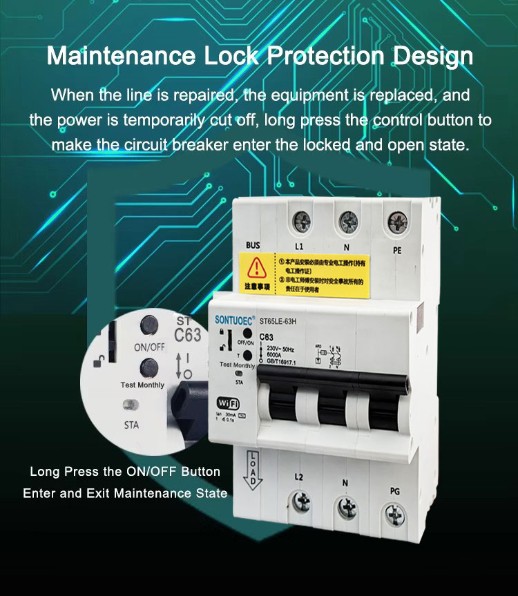 WiFi 4G Tuya ST65LE-63H ซีรี่ส์ Multi Multi-Functional RCBO Breaker วงจรอัจฉริยะ RCBO เหมาะสำหรับ 50Hz/60Hz, 230/400V 0 ~ 125a วงจรซึ่งมีฟังก์ชั่นเช่นการป้องกันโอเวอร์โหลดการป้องกันการลัดวงจรและการป้องกันการรั่วไหล ในขณะเดียวกันเบรกเกอร์วงจรอัจฉริยะนี้มีฟังก์ชั่นเป็นสวิตช์ OOF/บนรีโมทคอนโทรลทั่วโลกโดยสมาร์ทโทรศัพท์มือถือ